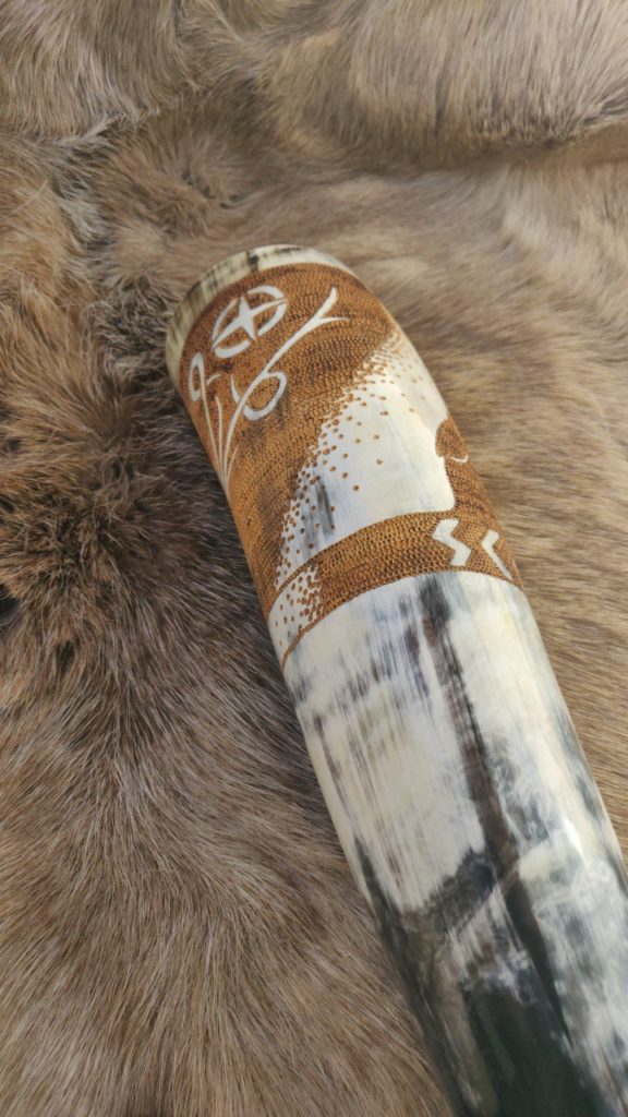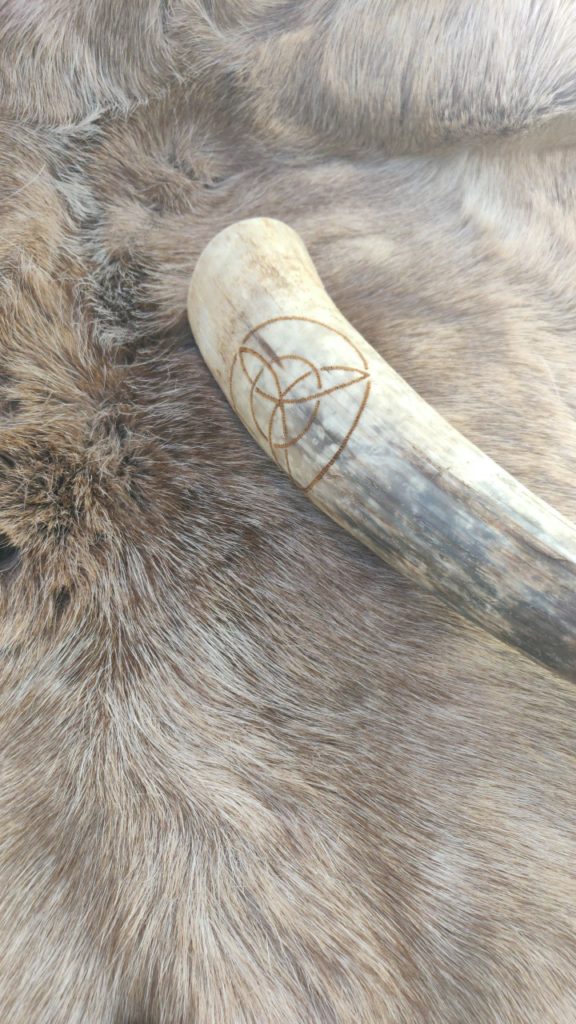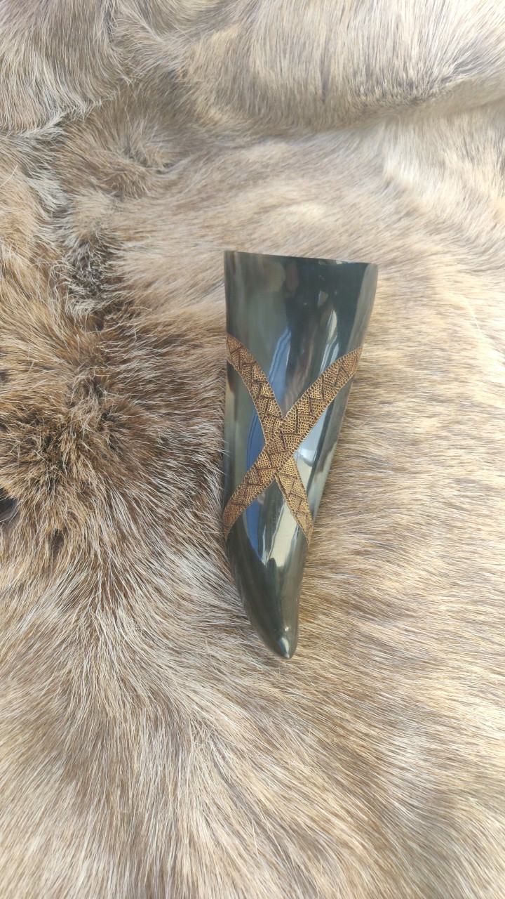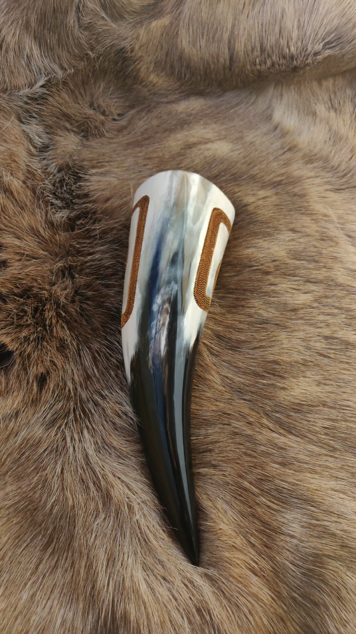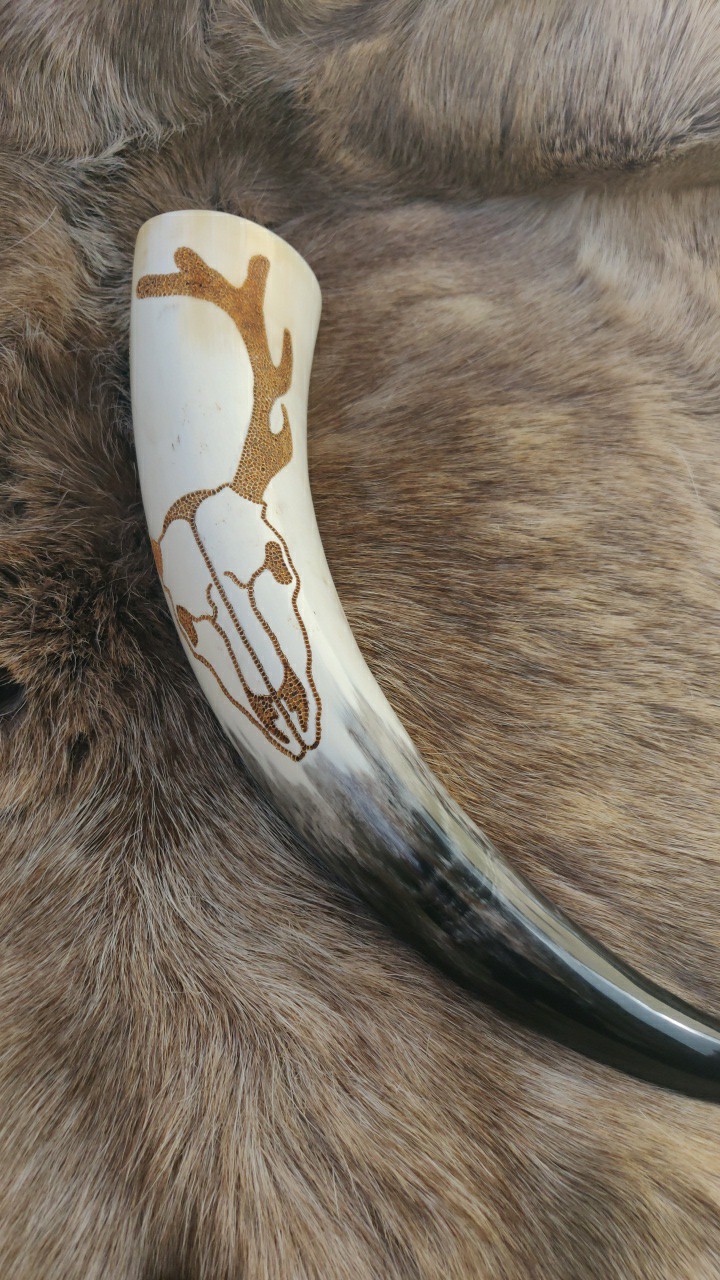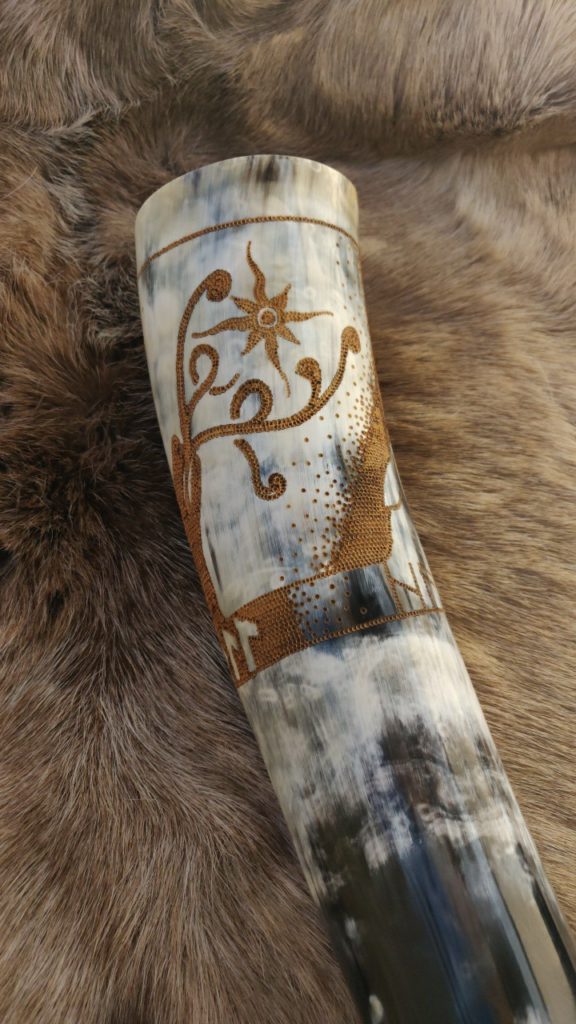 Trinkhörner habe ich bis jetzt auf zwei verschiedene Arten bearbeitet. Entweder habe ich sie gebrannt (das sind die Hörner mit den vielen braunen Punkten), oder ich habe sie graviert. Falls Sie Interesse an einem handverzierten, auf Sie zugeschnittenen Horn haben freue ich mich auf Ihre Kontaktaufnahme per Mail oder über Instagram.